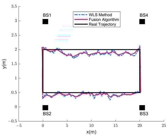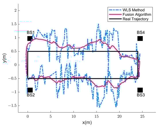 In the experiment, the handheld tag moved at a constant speed according to the preset trajectory. During this period, the system performed positioning every 0.1 s and stopped data acquisition when it reached the end point. In Scene A, the tag started from (−0.5, 0) and moved around a rectangle with a length of 24 m and a width of 1 m. In Scene B, the tag started at (0.5, 0) and moved around a rectangle with a length of 20 m and a width of 1.5 m. Since the LS method has a poor positioning effect in this space, its positioning was not presented in the report. The positioning results of WLS and the proposed algorithm are shown in Figure 11 and Figure 12. The solid line represents the real trajectory of the moving object.