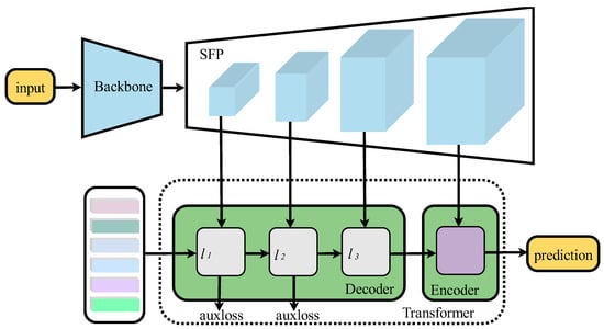 The backbone used for semantic segmentation usually constructs a collection of features from high to low resolution. Based on the idea of the feature pyramid [], we fused features of different resolutions by one feature space transformation (by a 1 × 1 convolutional layer) and one semantic feature extraction (by a 3 × 3 convolutional layer) and upsample them to the higher-level features to achieve the fusion of multiscale features. The pixel decoder module can be written as Equation (4):