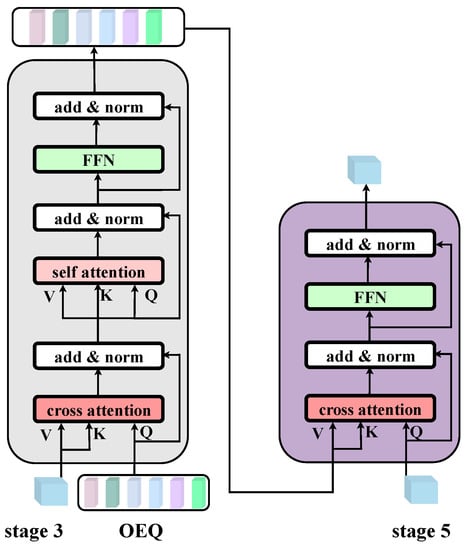 The original transformer model was proposed for sequence-to-sequence machine translation tasks. It consisted of multiple encoder-decoder architectures. There are several different application approaches in computer vision. VIT [] used only encoders; MaskFormer [] used only decoders; and DETR [] used both encoders and decoders. The transformer model consisted of multiple encoder-decoder architectures where the encoder is divided into two parts: self-attention and feed-forward networks. The decoder adds a cross-attention layer between these two parts compared with the encoder, which is used to aggregate the encoder’s output and the input features of the decoder [].