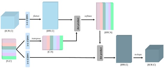 Global contextual information is significant, and attention can effectively improve the performance of long-range semantic modeling. CCNet [] extracted the correlation tensor from the underlying features to obtain the correlation between a pixel and its horizontal and vertical pixel points, and combined it with vector-containing semantic features. OCRNet [] extracts the relationship between each pixel and the object region in which the pixel is located, representing object features as category queries, and assigns the object features to each pixel in the sample using a transformer decoder-like structure with cross-attention. OCRNet provides an efficient method for contextual feature aggregation.