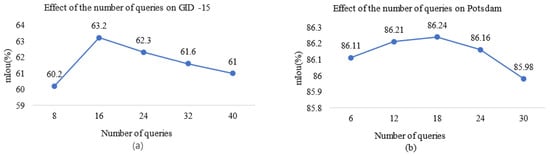 Learnable Object Embedding Queries (OQE). We defined a learnable object embedding query as a feature embedding a class of objects and performed an object-oriented feature augmentation on the final output by this query. The number of queries has a large impact on the result of the segmentation. Figure 7 shows our model trained with different numbers of queries on the Potsdam and GID-15 datasets. We find that our model performed best on both datasets when the number of queries was set to approximately 20. This indicates that we do not need to adjust the number of queries in different types of remote sensing datasets. Moreover, the object embedding queries can also enhance performance even without the transformer module. As shown in Table 3, even if we replaced the transformer encoder with a dot product operation and removed the transformer decoder, the performance of the model is still better than the baseline. The mIoU improved by 1.1 when the transformer decoder is added. The mIoU increased by 1.9 when the transformer encoder was also added.