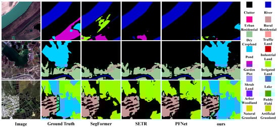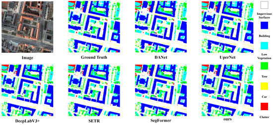 We also compared it with some semantic segmentation methods [,] based on output for the Potsdam test dataset in Table 8. For an objective comparison, we reimplemented some methods using VAN-tiny as the backbone for feature extraction. All methods used patches cropped to 512*512 for inference at a single scale. Our proposed method achieved the best results among all free available models.