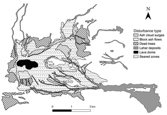 - Dale, V.H.; Delgado-Acevedo, J.; MacMahon, J. Effects of Modern Volcanic Eruptions on Vegetation. In Volcanoes and the Environment; Marti, J., Ernst, G.G.J., Eds.; Cambridge University Press: Cambridge, UK, 2005; pp. 227–249. ISBN 978-0-521-59725-8. [Google Scholar]