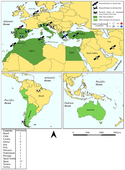 The olive (Olea europaea L.) is an iconic tree linked to the birth of some of the most ancient civilizations [1,2,3] and one of the most important cultivated tree species in the Mediterranean basin. Moreover, the olive tree is considered one of the best biological indicators of the Mediterranean climate [1,2,4,5]. According to archaeological and genetic studies, the olive tree was probably domesticated from its wild ancestor, the oleaster (Olea europaea ssp. europaea var. sylvestris), about 6000 years ago in the Middle East, in an area between Turkey and Syria [1,6,7]. The olive tree as we know it today results from selective breeding aimed at obtaining varieties without thorns (present with small olives in the oleaster trees) and fruits containing more oil. The history of the olive is increasingly intertwined with that of the people who learn to use and appreciate its main product, the oil, first used only industrially for lighting and as an ointment, and then also as a food product [8]. Olive growing shows a potential diversification of its production, and its multifunctionality is demonstrated mainly by the types of products it can provide: the main ones are oil and table olives [9,10]. Olive cultivation is widespread in fifty-eight countries on five continents. The consumption of its products extends to 179 countries, thus showing an extremely localized production against a dispersed demand in the international context [9]. Today, olive crops cover more than 12 million hectares [11] globally. Olive growing is roughly limited by 30° to 45° parallels [12]. The primary producers of olives are Spain, Italy, Greece, and Portugal, followed by other Mediterranean countries such as Tunisia, Morocco, Algeria, Egypt, and Turkey [11]. Among emerging producer countries, Argentina, Peru, Chile, and Australia are particularly noteworthy [11] (Figure 1), where super-intensive olive groves, irrigated and highly mechanized, represent the majority of newly cultivated areas [13]. Over the last few decades, given the high socio-economic importance of the olive sector over the last few decades, there has been much research involving Remote Sensing (RS) applications in olive growing, especially in precision agriculture (PA). As far as the use of RS platforms such as satellites, aircraft, and unmanned aerial vehicles (UAVs) in olive growing is concerned, a review of the literature showed the presence of several works devoted to it.