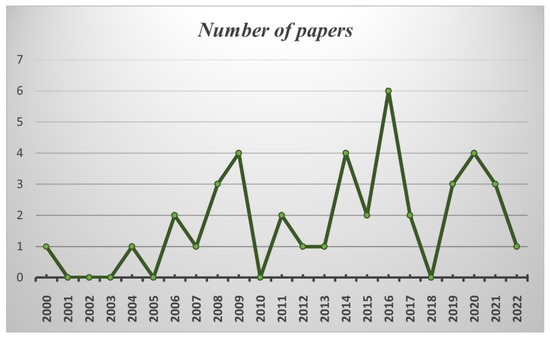 The trend of published articles based on publication year. The sources for the search of works reviewed were the following databases: Scopus (Elsevier), Google Scholar, and Web of Science (Clarivate Analytics). The x-axis shows the years of the period under consideration, while the y-axis shows the number of searches carried out. The researches considered are those carried out from the beginning of the year 2000 until the end of March 2022.
