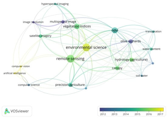 VOSviewer 1.6.18 software was used to perform cluster analysis on titles and abstracts (the choice is due to the lack of keywords in some of the works considered), having a frequency of at least six, and three categories were obtained (Figure 3). A temporal analysis of the period under consideration (beginning of 2000—end of March 2022) was performed. However, the software detected significant occurrences only from 2012. According to the content of words occurrence, three clusters were obtained, and in line with what is covered in this review, the most common were “environmental science”, “remote sensing”, and “NDVI”. “Environmental science” encapsulates well the content of this review focused on the analysis of research that has included applications of RS in olive growing aimed at the conservation of the olive landscape, its monitoring, the management of irrigation resources, and environmental issues arising from the olive industry. Occurrences involving the term can be traced back to the last five years. Noteworthy are the terms “transpiration”, “water content”, “water”, and “hydrology” inherent in both the problem of soil erosion, covered in Section 3, and irrigation and water resource preservation, covered in Section 6. As for the term “NDVI”, the most widely used of indices with the largest number of researches in which it was used, and “vegetation indices”, we have indicated in Table 1 the main indices used in the researches analyzed.