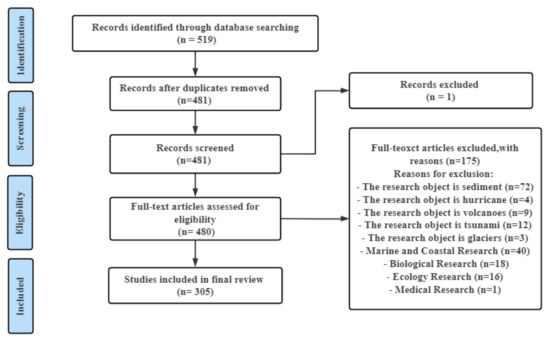 The document data of this paper comes from the core collection database of the Web of Science (WOS). Web of Science, as one of the most famous database sites, can provide high quality research data and ensure the reliability of research data [72]. In addition, WOS is recommended as the database of choice for Citespace analysis. In this study, the “AND” operator was used to perform Boolean operations on two search expressions by advanced search. The first search expression is as follows: TS = “flash flood *”, where “*” is a wildcard, including “flash flood”, “flash floods”, “flash flooding”, etc. The second search expression is TS = “fluvial flooding”. The third search expression is TS = “inundation”. The fourth search expression is TS = “susceptibility”. A total of 519 journal papers were searched after the deadline for the search was set as 8 July 2022, and the time interval was set from 2000 to 2022, including conference papers, conference reviews, and letters. Then, after the search results were refined, an editorial article (a study on glacioclimatology and magnetic mineralogy [73]), 175 irrelevant articles, and 38 duplicates were excluded to finally obtain 305 valid records (as the source of analysis data). The specific search process is shown in Figure 1. The article citation frequency for this study was based on the WOS Core Collection database. Five representative papers were mined in the search process, as shown in Table 2. These five articles focus on five subfields of research: assessment scale, assessment unit, assessment index, assessment model, and accuracy assessment in flash flood susceptibility assessment.