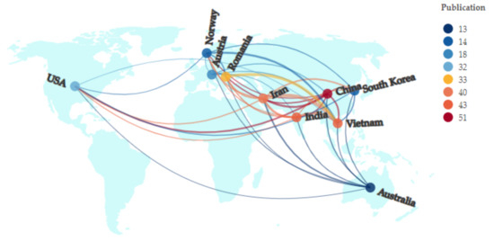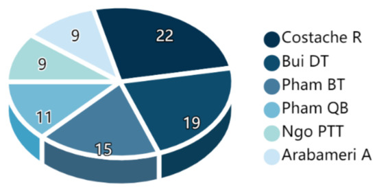 As one of the most productive authors, Costache has published 22 articles, 16 of which were published by Costache as the first author. With strong research ability, this author has maintained high productivity since publishing articles in 2017. For example, this author published four articles in 2019 and 2021 and five articles in 2020, and had higher productivity than most of the authors. Costache mainly studied the situation of flash floods in Romania, and assessed the flash flood susceptibility by different models [48,84,85] (or determined the flash flood potential index (FFPI) [31,86,87]). Arabameri participated in all of Costache’ studies [48,84,85]. Pham Q.B. participated in some of Costache’ research [48,74,88]. As the second most productive scholar, Bui published 19 articles during the search process, mainly studying the flash flood susceptibility in Vietnam. Bui proposed many new models for assessing flash flood susceptibility, such as the integrated algorithm of FURIA-GA, LogitBoost, Bagging, and AdaBoost taking fuzzy rule as the basis and the GA as the search method [76], integrated model PSO-ELM of extreme learning machine (ELM) and particle swarm optimization (PSO) [89], and integrated model based on multivariate adaptive regression splines (MARS) and particle swarm optimization (PSO) [90]. As the third most productive scholar, Pham B.T. studied the accuracy difference in assessing flash flood susceptibility through different intelligent learning models [36,45]. Ngo studied the flash flood susceptibility in northwest Vietnam and put forward integrated intelligent learning assessment models: an integrated model of hybrid quantum particle swarm optimization (QPSO) and Credal decision tree (CDT), QPSO-CDTreeEns model [34], and integrated model FA-LM-ANN of firefly algorithm (FA) and back-propagation artificial neural network (FA-LM) [91].