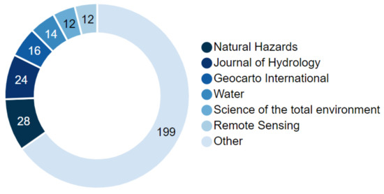 Figure 5 shows the journals with the number of papers published ranking in the top six. Many high-level research results on flash flood susceptibility assessment were concentrated in these journals. Natural Hazards, as a journal that pays most attention to the flash flood susceptibility assessment, has focused on the prediction and risk management of natural disasters such as landslides, floods, and earthquakes and has provided many high-level academic papers since its establishment in 1988. Geocarto International is a journal that serves many fields such as geographic information systems, remote sensing, geoscience, and environmental science. It pays attention to the new development, technology, and application of remote sensing and geographic information system. Journal of Hydrology and Science of the total environment are prominent journals. Science of the total environment involves environmental science. Based on IF data released by SCI, this journal publishes 9349 articles every year, and it is the journal with the most significant number of articles per year among the five journals and has great influence. Water covers all aspects of water research, including water science, hydrology, and water resources management. Remote Sensing is an international journal in the field of remote sensing. In about 11 years after its establishment, this journal published 5119 articles every year and attached importance to the quality and innovation of articles, which had a high influence in this field at that time. Among these five journals, Natural Hazards is an American journal, Journal of Hydrology and Science of the total environment are Dutch journals, Geocarto International, Water, and Remote Sensing are from the UK and Switzerland, respectively, all of which prove that developed countries with advanced science and economy have published a large number of publications with high quality [103].