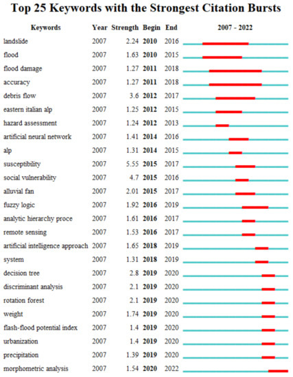 The keyword changes of citations can be detected through the Burst function of Citespace. Figure 8 shows the top 25 keywords with the strongest citation bursts from 2007 to 2022, including each research topic’s first appearance time and duration. As a word with the maximum burst strength, “susceptibility” began to appear in 2015 and ended in 2017, with a strength value of 5.55. The study of flash flood susceptibility is helpful in preventing flash flood disasters and reducing property losses and casualties. “Flood damage” is the keyword with the most extended duration. Floods are one of the most destructive natural disasters. Many countries and regions around the world suffer from flash floods, resulting in economic loss, damage to infrastructure, and loss of lives [21,22,23]. The keyword with high burst strength in recent years was “morphometric analysis”, which is also the current research hotspot. Morphometry was often used in watershed studies. The digital elevation model in the GIS system was used to generate morphometric parameters, such as area, perimeter, drainage frequency, etc., to evaluate the risk degree of flash floods in the watershed [25,35].