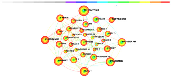 In Figure 9, the center color of the nodes of most authors is blue first and then continues until red appears, indicating that since 2016, a large number of authors in research fields have been cited, and currently, they still have a higher number of citations.
