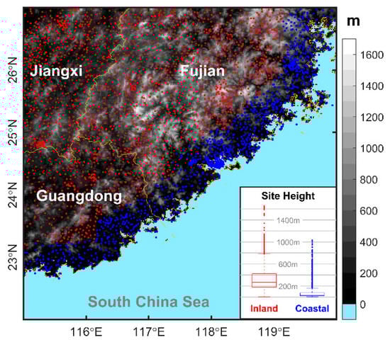 Three datasets were mainly used in this study: rain gauge observations, Himawari-8 infrared images, and ERA5 reanalysis data. In southeastern China (22.5°N–26.5°N, 115°E–120°E), there were over 2400 rain gauges, with a mean spacing between them of 4.4 km, operated by the China Meteorological Administration. Spatial distribution of the rain gauge sites (Figure 1) is fairly dense and relatively homogenous over the study domain and covers the whole ranges of terrain elevation between 0 and 1700 m over this domain. The rain gauge stations are defined as coastal sites if their locations are within the 40-km range of the coastlines of southeastern China, while those beyond the 40-km range are defined as inland sites. The 10-min rainfall data from these rain gauges were utilized to analyze the warm-sector rainfall. The 10.4-μm infrared brightness temperatures (BTs) from the Advanced Himawari Imager onboard Himawari-8 were available at a scan interval of 10 min and a spatial resolution of 2 km at nadir []. The BT data were used to identify and track MCSs. The ERA5 reanalysis [] provided by ECMWF comprises hourly atmospheric variables with a grid spacing of 0.25° and was used to assess the environmental conditions. In addition to these three datasets, radar mosaics of composite reflectivity over southeastern China provided by the Fujian Meteorological Bureau were utilized as well.