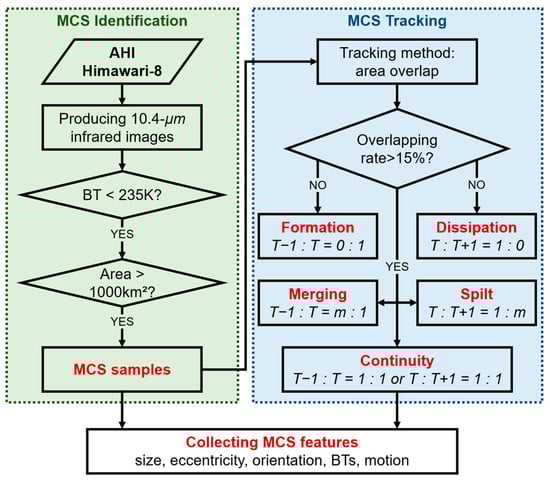 Flowchart of the identification, tracking and feature collection of mesoscale convective systems (MCSs) based on the Himawari-8 observations in this study.