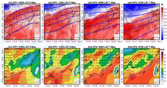 On 6–7 May 2018, two rainfall episodes occurred in succession over southeastern China. Both episodes occurred in the warm sector to the south of a synoptic front propagating southeastward, as indicated by the high gradient belt of equivalent potential temperature (θe) in Figure 4a1–a4 (also refer to the front location analysis based on the surface weather maps in Figure S1 in the Supplementary Materials). Two rainfall episodes both began with the occurrence of local cloud clusters over southeastern China, which developed into MCSs in the following hours (Figure 5), ahead of a large-scale cloud shield associated with the synoptic front. The first rainfall episode (EP1 hereafter) started in the early morning on 6 May and dissipated at night. The second rainfall episode (EP2 hereafter) started at midnight on 7 May and its rainbands eventually merged with the frontal rainbands in the evening. Two 17-h periods were, respectively, selected for the following analyses of EP1 and EP2: 0500–2200 LST (LST = UTC + 8 h) on 6 May and 0000–1700 LST on 7 May.