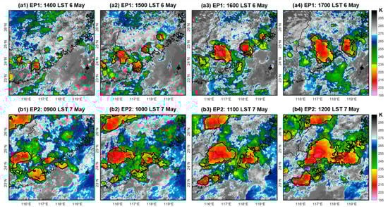 Hourly images of the infrared brightness temperatures (BTs; units: K) measured by Himawari-8 satellite with the identified MCS samples (areas enclosed by black solid lines) for (a1–a4) between 1400 and 1700 LST on 6 May 2018 in EP1 and (b1–b4) between 0900 and 1200 LST on 7 May 2018 in EP2. The provincial boundaries are denoted by gray curves.