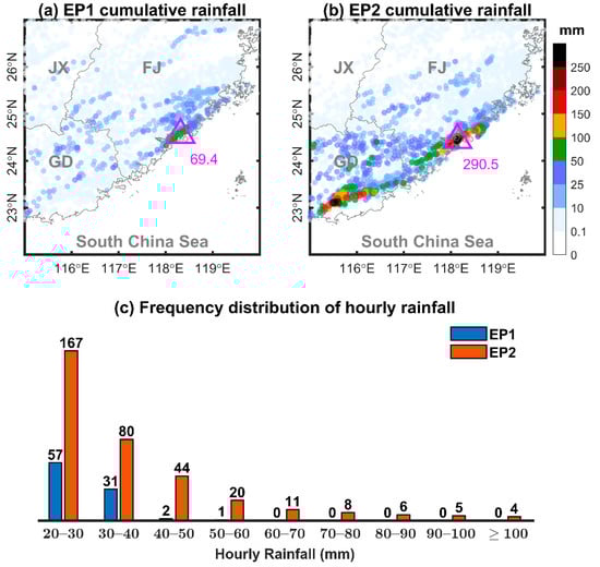 Figure 6a,b show the distributions of rain-gauge-measured rainfall totals in EP1 and EP2, respectively. Notice that only the rainfalls at least 200 km away from the fronts were counted in order to ensure the rainfalls were warm-sector nature and less influenced by the fronts, as suggested in previous studies (e.g., [,,]). Both EP1 and EP2 had a rainfall hotspot along the southeast coast of Fujian province, while EP2 had a cumulative rainfall maximum (290.5 mm) over four times that of EP1 (69.4 mm). In EP2, there was another >250 mm rainfall hotpot near eastern Guangdong province. Compared to EP1, EP2 had a stronger rain rate with remarkably more hourly rainfall of magnitude exceeding 20 mm (Figure 6c). Four hourly rainfalls of magnitude exceeding 100 mm were observed in EP2, with a maximum of 107.5 mm that was about twice that of the maximum in EP1 (51.6 mm). The maximum 1-h and 3-h rainfalls in EP2 were 1.2 and 2.4 times the local historical records, respectively []. This record-breaking rainfall event caused severe urban inundation and societal impacts in Xiamen (around 24.5°N, 118.0°E), a coastal city with a dense human population [].