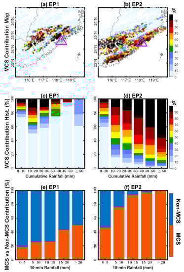 Moreover, MCSs played a more important role in generating more intense rainfall within a short duration in both episodes. This is evidenced by the increasing trend in the proportion of MCS-related samples as the 10-min rainfall increased from 0–5 mm to ≥20 mm (Figure 7e,f). However, the MCS contributions to different ranges of 10-min rainfall in EP1 were not so significant as in EP2. In a lower range of the 10-min rainfall in EP1, a higher proportion of samples could be attributed to non-MCS systems, again, consisting of the small isolated convective storms and shallow convection. For the subset with 10-min rainfall over 20 mm, all of the samples in EP2 were contributed by MCSs, whereas only half of the samples in EP1 were contributed by MCSs.