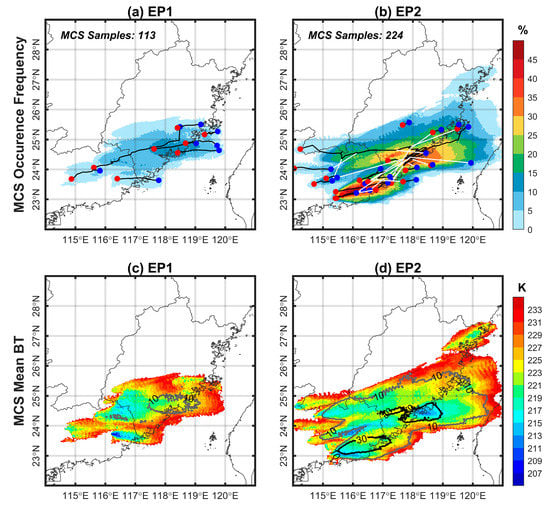 Spatial distributions of (a,b) the occurrence frequency of the identified MCS samples and (c,d) the averaged brightness temperature (BT) along the MCS pathway in two successive warm-sector rainfall episodes over southeastern China (a,c) between 0500 and 2200 LST on 6 May 2018 (EP1) and (b,d) between 0000 and 1700 LST on 7 May 2018 (EP2). MCS trajectories are given by black (“continuity” status) and white (“merging” status) lines in (a,b), with red dots denoting the origin and blue dots denoting the terminus. The 10% and 30% occurrence frequencies of the MCS samples are contoured in gray and black in (c,d), respectively. The provincial boundaries are denoted by gray curves.