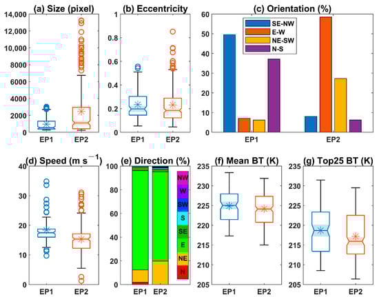 Comparison of the MCS features between EP1 and EP2 in terms of the (a) size (satellite pixel), (b) eccentricity (smaller magnitude indicates a more linear shape), (c) orientation, (d) speed and (e) direction of movement, (f) brightness temperature (BT) average of all pixels of each MCS sample, and (g) BT average of the coldest 25% pixels of each MCS sample. When examining the MCS motion, only the MCS samples without a merging or splitting process were considered, to avoid the unreliable motion caused by the sudden displacement of an MCS sample. The boxplot style is similar to that in Figure 1. The asterisk symbol within the box denotes the sample average.