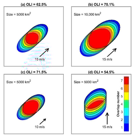 Schematic diagrams showing how the proposed overlap index (OLI) varies with the size, moving speed of MCS, and the angle between the MCS orientation and moving direction. In (a), the MCS sample has a size of 5000 km2, a linear shape with an eccentricity of 0.2, a northeast–southwest orientation, and moves northeastward at a speed of 15 m s−1. Panels (b–d) are similar to (a), except the size is 10,000 km2 in (b), the moving speed is 10 m s−1 in (c), and the moving direction is northward in (d). The calculation of OLI is based on the Himawari-8 infrared images, with a pixel resolution of 2 km and a scan interval of 10 min, by extrapolating the targeted MCS sample for one hour (i.e., a total of seven timestamps as denoted by the rings in each panel). For an MCS sample, a larger proportion of pixels with higher overlap numbers along the MCS pathway tend to produce a larger OLI.