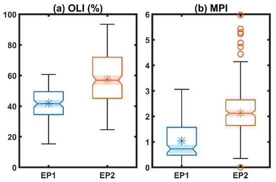 Comparison of two proposed indices––(a) overlap index (OLI) and (b) merging potential index (MPI)––between EP1 and EP2. The boxplot style is similar to that in Figure 1. The asterisk symbol within the box denotes the sample average.