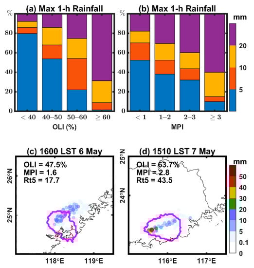 It seems that OLI and MPI can serve as practical indicators for subsequent rainfall production. All the MCS samples in the two episodes were divided into four subsets according to their OLI/MPI magnitudes (Figure 13a,b). Generally, the MCSs with a higher OLI/MPI were more capable of producing stronger maximum rainfall in the next hour (calculated as the average of the top five hourly rainfalls belonging to an MCS sample, to avoid overestimation by a single extreme rainfall sample). For instance, ~80% of MCS samples with <40% OLI produced only light (<5 mm) hourly maximum rainfall, while ~70% of MCS samples with ≥60% OLI produced hourly maximum rainfall over 20 mm. This is also demonstrated by the two specific samples shown in Figure 13c,d. These two MCS samples both appeared nearby the coast and had a similar size of between 1000 and 1200 pixels, but the one with higher OLI and MPI produced a maximum rainfall of 43.5 mm in the following hour, which was about 2.5 times that of the other one (17.7 mm). Similar results were obtained when investigating the maximum 10-min rainfall over the next hour (Figure 14). The potential of OLI and MPI as precursors shows great promise in aiding the nowcasting of rainfall produced by MCSs.