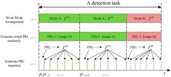 Variable parameter radar (VPR) usually refers to radars with variable inter-pulse time intervals, which is an important means of countering reconnaissance and jamming [1,2]. For a multi-function radar with variable parameters, whenever it shifts between different work modes, its pulse repetition intervals (PRIs) will change agilely within a certain range, and the changed PRIs can hardly be predicted by previous ones. This parameter variability places a great burden on Electronic Support Measures (ESM) and Electronic Counter Measures (ECM). However, for software-defined radars, a stable functional relationship hides in multiple PRIs of the same working mode and does not change with the agility of parameters, which is called PRI feature.