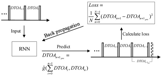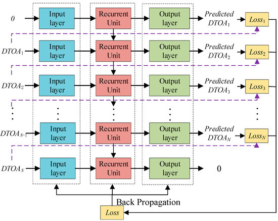 This is a self-supervised learning process, and the RNN processes the pulse sequence sequentially. After receiving each input, there will be a single-step prediction output. The DTOAi and accumulated time of previous pulses are input into the RNN to get a predicted according to Equation (6). There is a deviation between the true DTOAi+1 and the predicted one. The prediction loss is then calculated and accumulated according to Equation (7), and the BP algorithm [26] is then used to optimize the RNN parameters. The unfolded diagram of this process is shown in Figure 3.