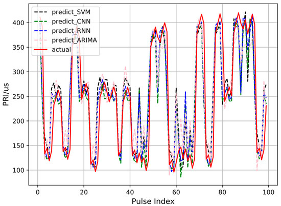 As shown in Figure 4, the four prediction models can well predict trends of the PRI sequence. There would be a sharp deviation between the predicted and true values at the conversion of pulse groups due to its randomness. Actually, the prediction ability in a pulse group is the main difference between different models. In Table 1, we measure the prediction performance through commonly used indicators such as MAE, RMSE, MPE, MAPE, and R2 (Their full names are shown in Appendix A). One can conclude easily from the results in Table 1 that the proposed RNN model realizes the prediction of VPR pulse trains best among the listed methods.