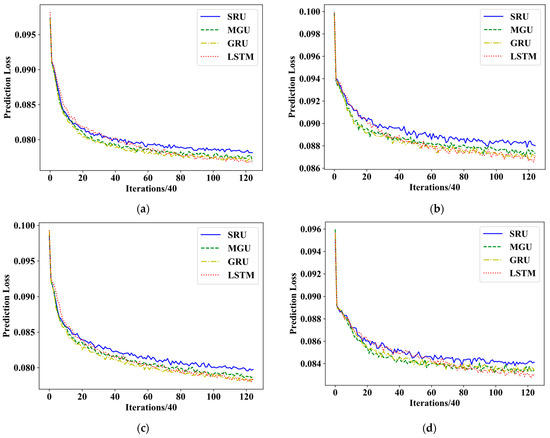 We can see that the less data noise, the smaller the prediction loss. For different recurrent units, the models with gated units have lower prediction loss than that without gated units (SRU), and the more gated units, the better. However, the models with fewer gated units (SRU, MGU) have faster training convergence.