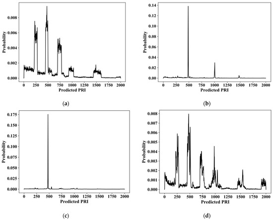 At first, only one pulse does not form a DTOA, but the model already has an input. According to Equation (3), we input the defined into the trained RNN, and the output indicates the possible value of the first DTOA, as shown in Figure 6a. The first three ranges show initial PRI ranges of three set pulse groups, and remaining ranges with low probability are high-order DTOAs caused by missing pulses. This result conforms to Equation (5). Then, when the second pulse is intercepted, a first DTOA is obtained as 456 us, and its further prediction spectrum is shown in Figure 6b. Its predicted PRI is 487 us with the maximum possibility. After that, we input the predicted value into the RNN model to continue iterative predictions. Until we input the PRI (476 us) with the maximum probability in Figure 6c, the predicted PRI peak in Figure 6d is significantly lower than that in the last prediction, and there are multi-range peaks. This scene is caused by the uncertainty of the next DTOA during pulse group conversion, which means this pulse group has ended and we have finished the pulse group prediction.