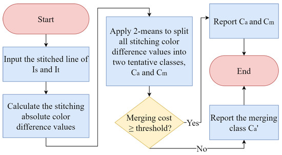 When setting K = 2, we first adopt Lloyd’s K-means clustering process [29] to split all absolute stitching color difference values, which constitute the feature space used in the clustering process, into two tentative classes, and . Initially, two randomly selected absolute stitching color difference values form the centers of the two tentative classes. Next, based on the minimal 2-norm distance criterion, every absolute color difference value is assigned to one class center. Then, the center of each class is updated by the mean value of all absolute color difference values in the same class. The above procedure is repeated until two stable classes are found. Then, we propose a merging cost-based process to examine whether the two tentative classes can be merged into one aligned class or not. If the two tentative classes cannot be merged into one class, we report the two tentative classes as the partition result; otherwise, we report the aligned class as the partition result. It can be said that our split-and-merge approach consists of one two-means splitting process and one merging process.