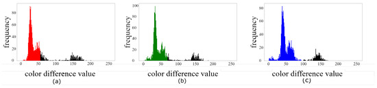 where and denote the c-color, c ∈ {R, G, B}, values of and , respectively. For the stitching line in Figure 1b, the three distributions of , , and are shown in Figure 2a, Figure 2b, and Figure 2c, respectively. From Figure 2a–c, we can observe that the three distributions of all absolute stitching c-color difference values tend to be two classes, namely the aligned class and the misaligned class.