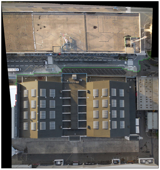Based on the eight original testing UAV image-pairs, which are selected from the website: https://www.sensefly.com/education/datasets (accessed on 2 September 2018) provided by the company “senseFly”, the corresponding eight stitched images are produced by using Yuan et al.’s graph cut-based method [10]. The eight testing stitched images can be accessed from the website in Supplementary Material. For convenience, let the resultant eight stitched images under different misalignment situations be denoted by the set symbol with || = 8. For each stitched image in , the misalignment ratio of the stitching color difference values is within the interval [0%, 15%].