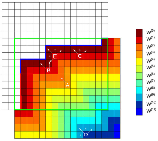 Next, the target pixels () neighboring constitute the first wavefront , and these target pixels in are labeled as red. We continue the wavefront marching-based labelling operations until all wavefronts are constructed. As depicted in Figure 6, there are 12 constructed wavefronts for the target pixels in . It can be easily verified that the proposed wavefront approach takes time, where the big-O notation denotes an upper bound complexity [30], to construct all wavefronts for all target pixels in . Let the resultant wavefronts be denoted by , , …, and with , where the wavefront number m depends on the stitching line configuration and .