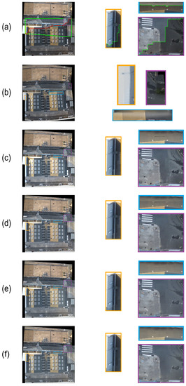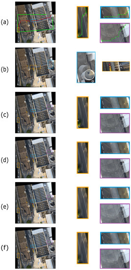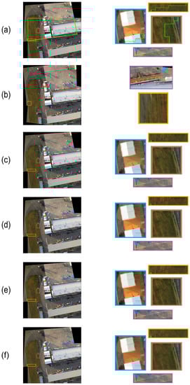 The first testing UAV stitched image, which is taken from the set , is illustrated in Figure 8a. After performing the five considered methods on Figure 8a, Figure 8b–f shows the color correction results by using the MBB method, the HM-based method, the GP-based method, the GBJI-based method, and our method, respectively. It is notable that for the MBB method, the experimental demonstration is based on the tool that is downloaded from http://www.autostitch.net/ (accessed on 23 October 2021), so it is different from the other color correction methods. From Figure 8b–f, we observe that our method achieves the best perceptual gradation effect near the misaligned stitching target pixels, but for the four comparative methods, there are unsmooth artifacts. Our method also preserves a good color correction effect in the other areas.