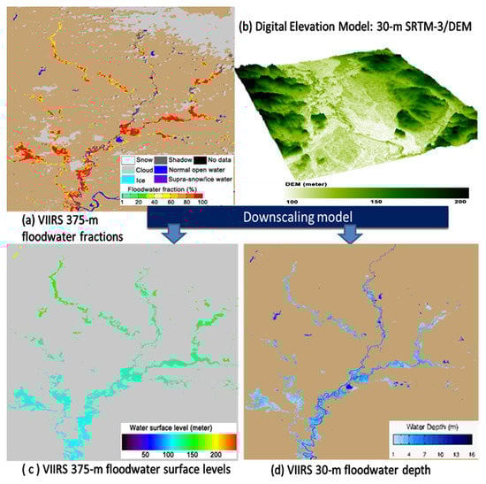 Figure 1 illustrates the downscaling process and the inputs and outputs for the downscaling model. Using VIIRS as an example, when the VIIRS floodwater fraction data at the original 375 m resolution (Figure 1a) are combined with high-resolution DEM data (Figure 1b) using the downscaling process, the floodwater surface level at VIIRS 375 m resolution (Figure 1c) and a high-resolution floodwater depth map (Figure 1d) can be derived.
