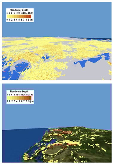 The downscaled or enhanced 30 m flood water depth map shown in Figure 3 (lower) further confirms this flooding distribution in greater detail. The 3D floodwater depth map in Figure 4 (upper) emphasizes southern Florida’s flooding situation, in particular. Since the flooding in southern Florida did not cause severe damage, and the most severe damage occurred near the Fort Myers area, we also generated a 3D flood map for southwest Florida near the Fort Myers region, where severe flooding caused catastrophic damage. From Figure 4, it is very interesting to compare the differences between the floodwaters in southern Florida, near the Everglades National Park, and in southwest Florida, near Fort Myers. We can see how the flooding in southern Florida occurred over the flat wetlands and was a “non-hazard” type of flood, while the flooding in Southwest Florida occurred in cities and over complex coastal terrains, especially in Fort Myers, Cape Coral, North Port and near Port Charlotte. This is the type of real “hazard” flooding, which can cause significant damage.