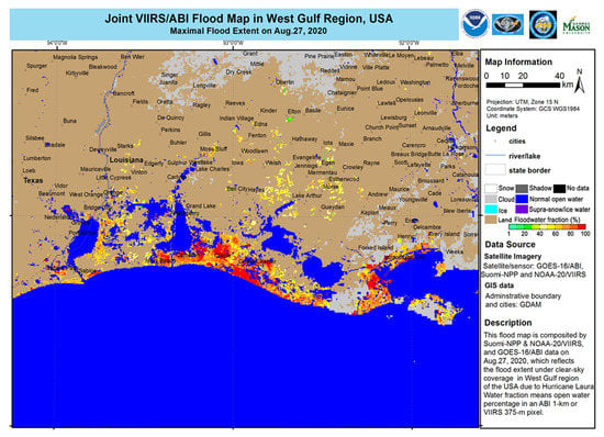 Two years ago, on August 27, 2020, Hurricane Laura made landfall at Cameron, Louisiana as a deadly and destructive hurricane, causing nearly 10-foot-high storm surges and severe flooding in the Cameron region. Figure 4 shows the 2D flood extent map as presented by the floodwater fraction at 375 m resolution derived from the joint VIIRS and ABI data recorded during the flooding event caused by Hurricane Laura in the West Gulf region on 27 August, 2020.