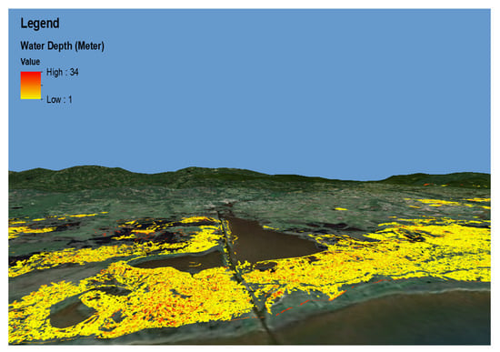 Figure 6 shows the VIIRS flood extent map as represented by floodwater fraction at the original 375 m resolution, while Figure 7 demonstrates the downscaled 30 m floodwater depth derived from the downscalimg model in the West Gulf region due to Hurricane Laura on 27 August, 2020. As compared to the flood map at the original 375 m resolution (Figure 6), the enhanced resolution (30 m) map (Figure 7) provides more detailed flood information. Floodwater depths in the 3D view are illustrated with ArcGlobe, as shown in Figure 8. In comparison to the 2D visualization of the same area, it was found that the 3D map can demonstrate floodwater depths in greater clarity relative to the underlying terrain conditions. It is important to observe the direct perception of the potentially different effects caused by the inundation due to Hurricane Laura in the West Gulf region. The 3D map relating to floodwater depth may provide additional information for rescue efforts and damage assessment.