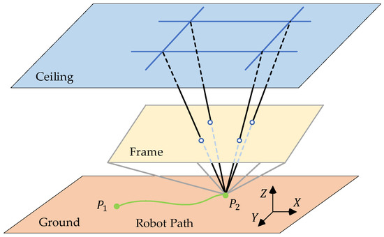 The observation target of the ceiling-view VO method is the ceiling that contains texture and structural constraints. The camera moves horizontally on the ground, and its motion trajectory is approximately parallel to the ground plane and the ceiling plane. In such a scene, the surrounding obstacles will not block the observed ceiling.