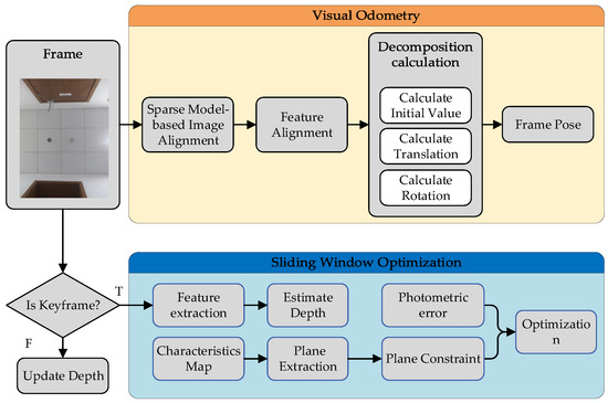 As shown in Figure 2, the system is mainly composed of two components: visual odometry and sliding window optimization. The visual odometry module estimates the camera motion between frames, and the sliding window optimization module optimizes the local feature map. First, the system receives the image and sends it to the visual odometry module, calculates the initial value of the relative pose of the adjacent frames using the sparse model image alignment method, and then uses the feature alignment method to optimize the position of the features on the current frame. After that, the system transfers the image to the backend, sliding the window optimization module, and determines through the keyframe selection strategy whether the current frame is a keyframe. If the current frame is not a keyframe, the depth filter is iterated using the frame. When the iteration reaches the convergence condition, the feature is inserted into the feature map. The keyframe is added to the keyframe sequence of the current local map, and the common plane in the space is extracted. Subsequently, the photometric error and the geometric constraint of the plane are used to optimize the position of features. For keyframes, we need to detect new features and establish and initialize the depth filters.