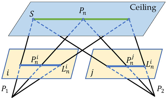 S denotes a space straight line, and are the plane straight lines projected in the i-th frame and the j-th frame, respectively, as shown in Figure 4. Any corresponding points on two straight lines and satisfy the constraint of homography matrix: