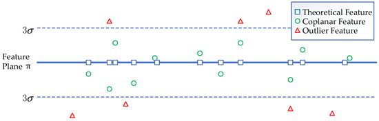 In the feature map, the existing feature points are used to fit the ceiling plane . The points within the tolerance are regarded as coplanar features on the surface, and the points outside the tolerance are eliminated without fitting the final feature plane. The basis for fitting the plane is that theoretically, the features on the ceiling must be on the plane.