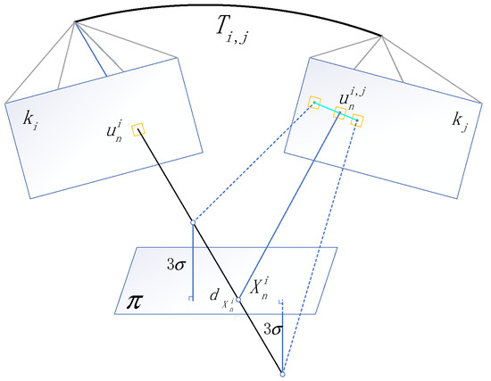 Taking into account the error of the depth filter iteration depth to calculate the spatial coordinates, we empirically set the threshold to . If the distance between the point and the plane is less than three times the MSE of the plane fitting in the previous stage, the point is considered to be on the plane, as shown in Figure 5.