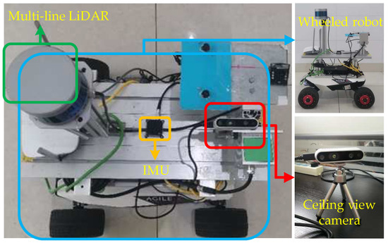 The wheeled robot is equipped with an upward-looking camera for collecting ceiling images and other sensors, such as LiDAR and IMU.