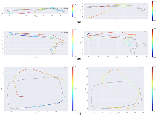 The trajectories are estimated with Struct-PL-SVO (the first column) and PL-SVO (the second column) from the ceiling dataset (ground truth in gray), and the color represents the absolute error of the trajectory. (a) The trajectory estimated in Floor 3 sequence 1. (b) The trajectory estimated in Floor 1 sequence 3. (c) The trajectory estimated in Parking lot sequence 5. (It is noticeable that the color represents the error of the trajectory only in a single image, and the unit is inconsistent between different images).