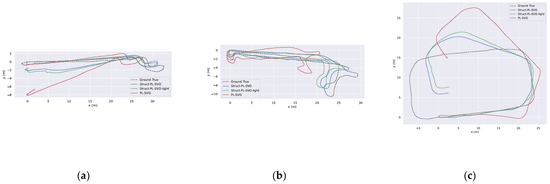 The aligned trajectories with Struct-PL-SVO (in blue), Struct-PL-SVO-light (in green), and PL-SVO (in red) from the ceiling dataset (ground truth in gray). (a) The trajectory estimated in Floor 3 sequence 1. (b) The trajectory estimated in Floor 1 sequence 3. (c) The trajectory estimated in the Parking lot sequence 5.
