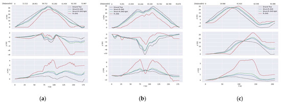 The aligned trajectories of different systems on x, y, and z axes separately. The distance indicates the current distance covered by the robot trajectory. (a) Floor 3 sequence 1. (b) Floor 1 sequence 3. (c) Parking lot sequence 5.