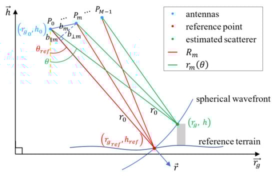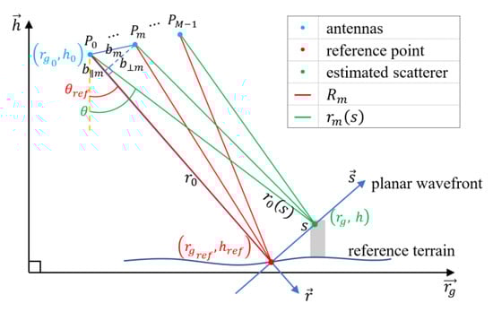 As shown in Figure 2, we only consider the ground range–height plane of an azimuth sample position and assume all targets are isotropic point-like scatterers for the sake of convenience. The mode of tomography is single pass with an antenna array with antennas at positions , and we set antenna as the master antenna. Assume that these antennas are colinear but not necessarily uniform, which is common in practice. There are two coordinate systems, one is called ground frame and is made up of the ground range and the height (perpendicular to the ground range), and the other is called radar frame and is made up of the slant range and elevation (normal to the LOS) []. is the distance between the master antenna and the center of the pixel at the same azimuth position, and is also the minimum distance from master antenna to the planar wavefront in the planar wavefront geometry,